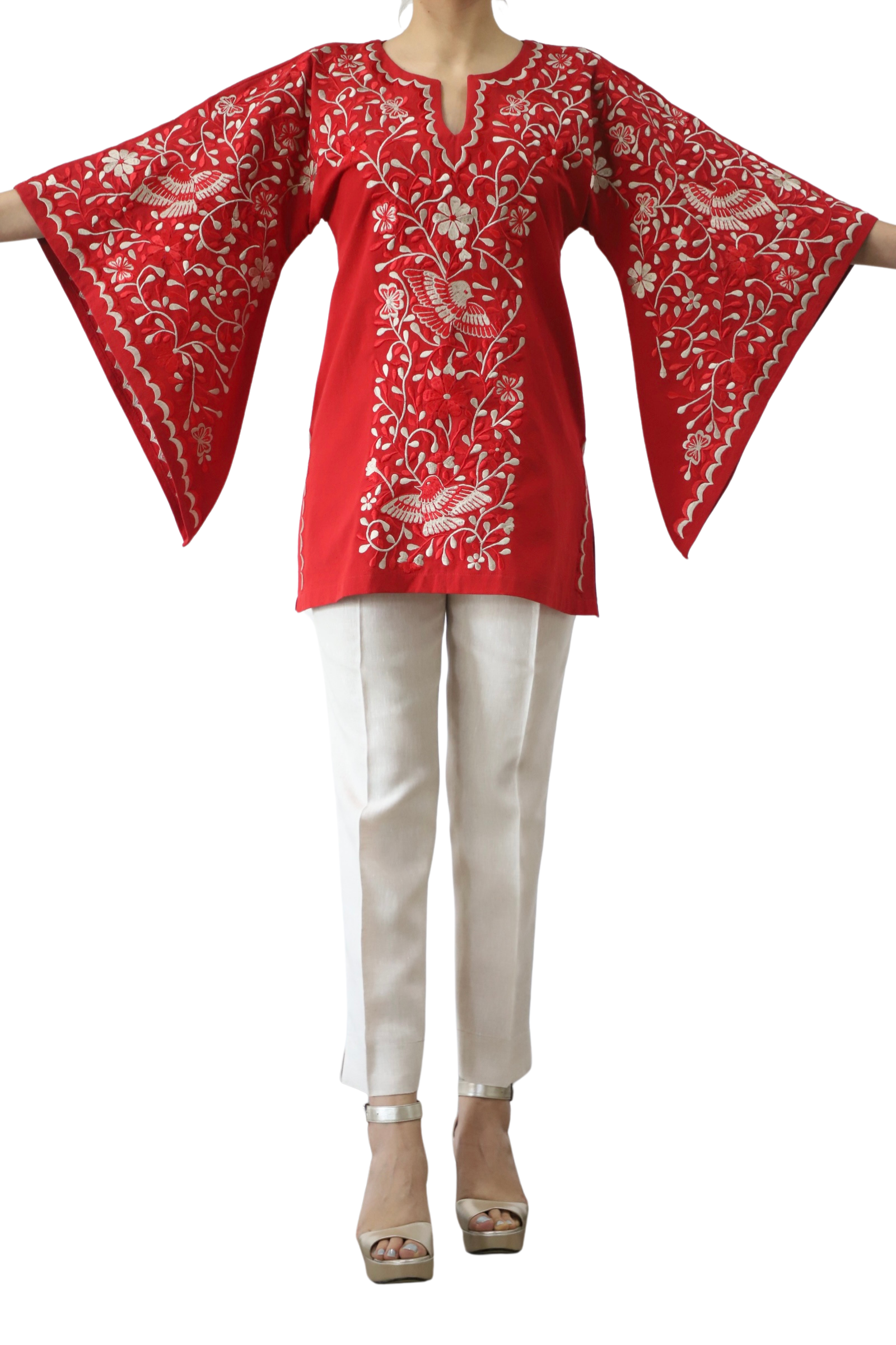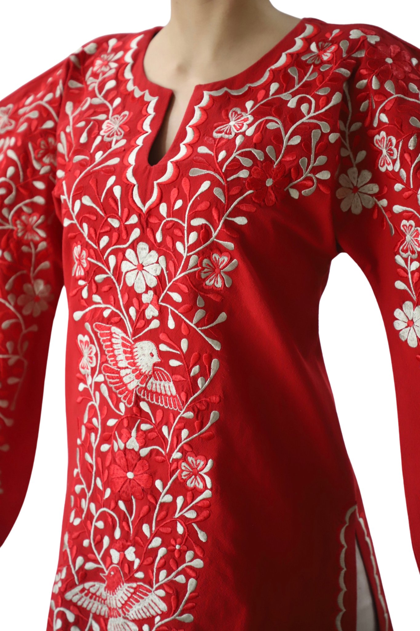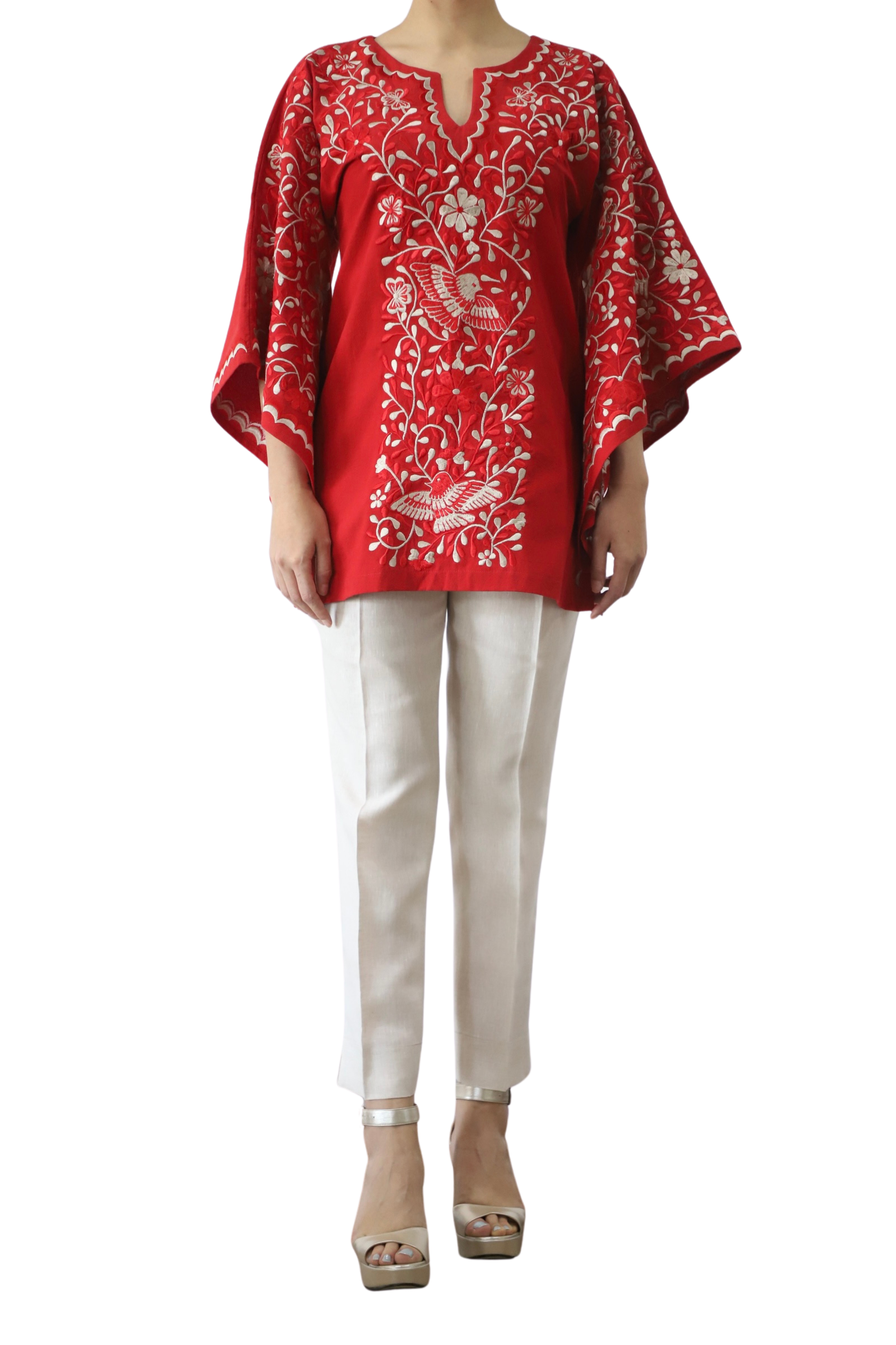 Este blusón de lino rojo destaca por su hermoso bordado artesanal, que resalta la riqueza cultural mexicana con un diseño único y vibrante.