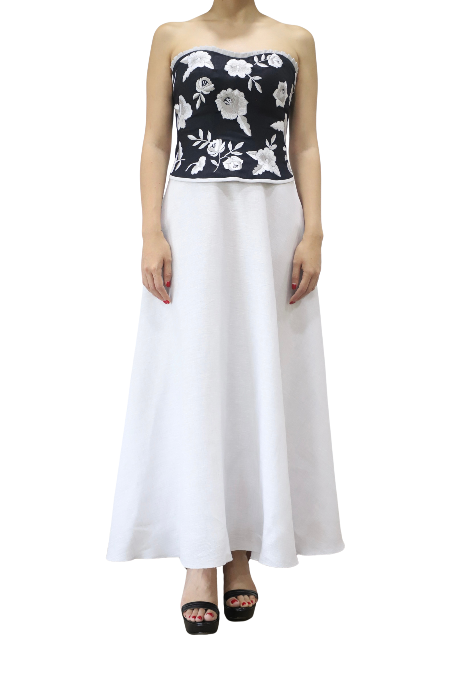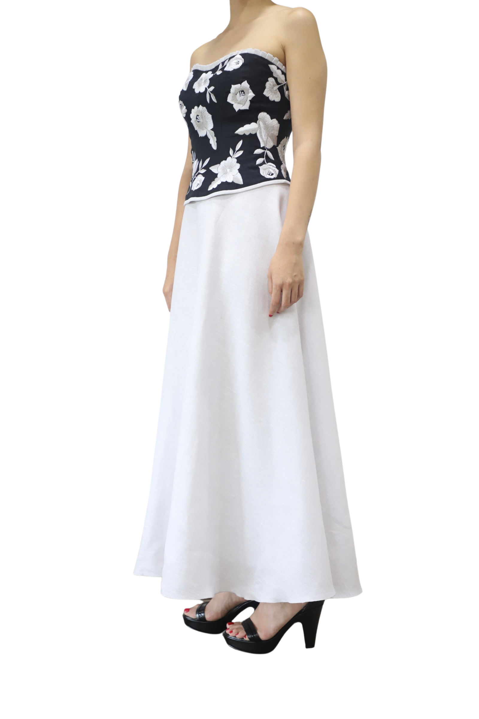 Este sofisticado conjunto combina un corset negro con bordados florales en blanco y una falda amplia blanca, logrando un equilibrio perfecto entre elegancia y frescura. El corset sin tirantes realza la figura con su diseño estructurado, mientras que la falda fluida añade movimiento y comodidad. Ideal para eventos formales, bodas o celebraciones especiales, esta pieza es una representación de la moda mexicana con un toque contemporáneo.